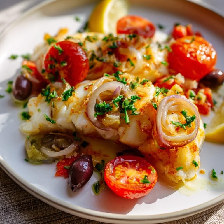 Save to Pinterest I was standing in my kitchen on a Tuesday night, staring at a pack of cod and a basket of tomatoes that needed using up. The idea of juggling multiple pots felt impossible after a long day. That's when I remembered a simple tray bake my neighbor once described—fish, tomatoes, olives, everything roasted together. I tossed it all on one sheet, slid it into the oven, and twenty minutes later, the smell alone made me forget how tired I'd been.