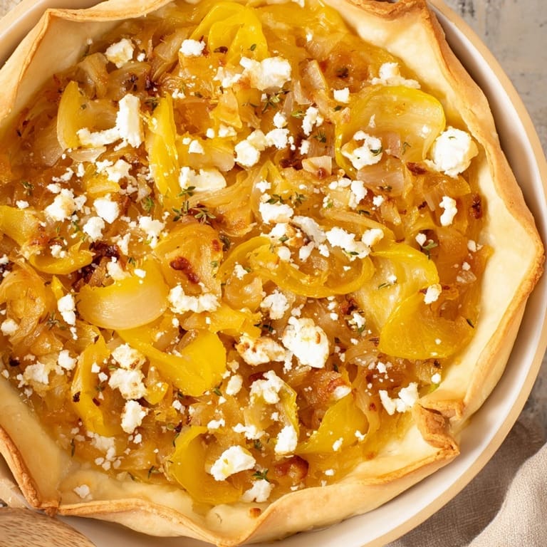 Save to Pinterest My neighbor handed me a bag of onions from her garden one autumn afternoon, far more than I could use before they sprouted. I stood in my kitchen wondering what to do with them all when I remembered a tart I'd seen in a cafe window in Lyon years ago. The onions caramelized slowly on the stove, filling the house with a smell so sweet and savory that my husband wandered in twice asking when dinner would be ready. That tart became our Sunday ritual.