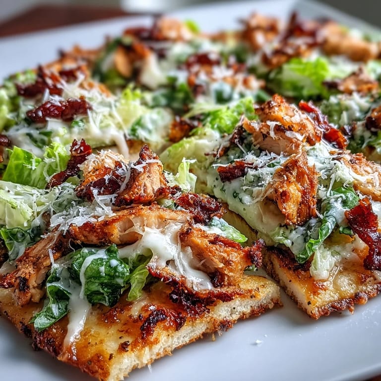 I've learned that this base is genuinely flexible—the beauty is in the structure, not locked into one set of toppings. You can swap Caesar for ranch or a simple vinaigrette, trade romaine for arugula or mixed greens, or skip tomatoes entirely if they're not your thing. The chicken crust stays reliable no matter what you pile on top.