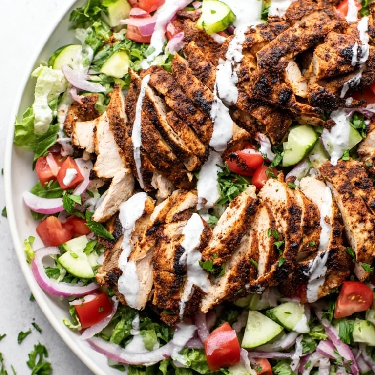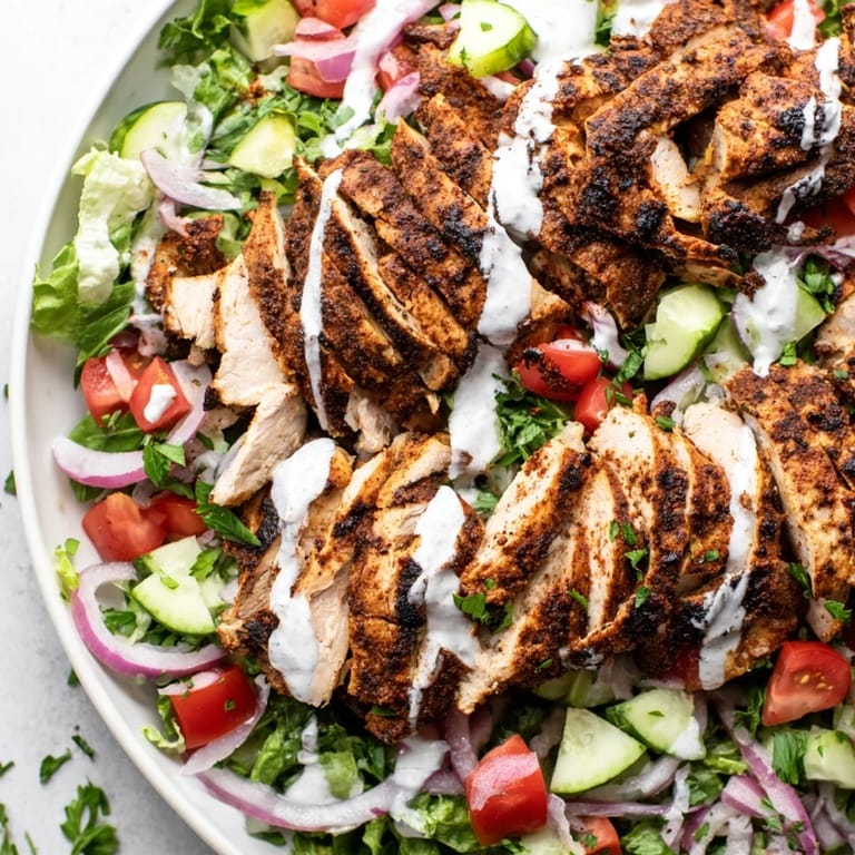 I started making this salad during a particularly hot summer when turning on the oven felt like punishment. My neighbor popped over one evening while I was grilling the chicken on a cast iron pan with the windows open. She asked what smelled so good, and I ended up making double the next night so we could eat together on the back porch. Now she texts me every few weeks asking if it's shawarma night.