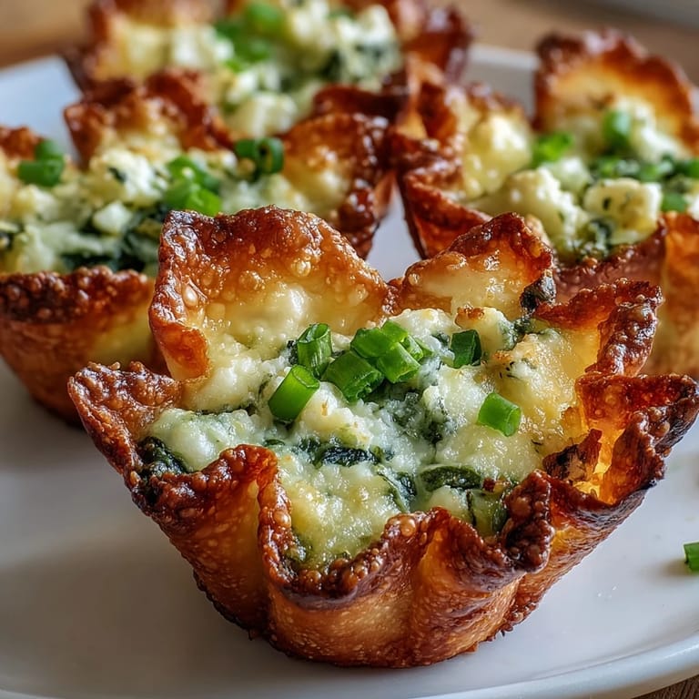 Save to Pinterest My neighbor showed up with a platter of these at a potluck, and I watched them disappear in minutes—people were grabbing them like they'd never seen food before. The crispy wonton exterior gave way to this creamy, tangy spinach and feta filling that somehow felt both elegant and completely unpretentious. I asked for her recipe that night, and she laughed, saying it was her secret weapon for making people think she'd spent hours in the kitchen when it was really just thirty-five minutes of casual kitchen magic.