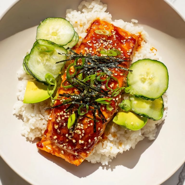 This bowl is less about following a recipe and more about understanding why each element is there. The warm rice soaks up the glaze. The cool cucumber and avocado balance the heat and richness. The nori adds a textural snap and reminds you that you're eating something intentional. Every component has a job, and when they're all there together, it feels complete.