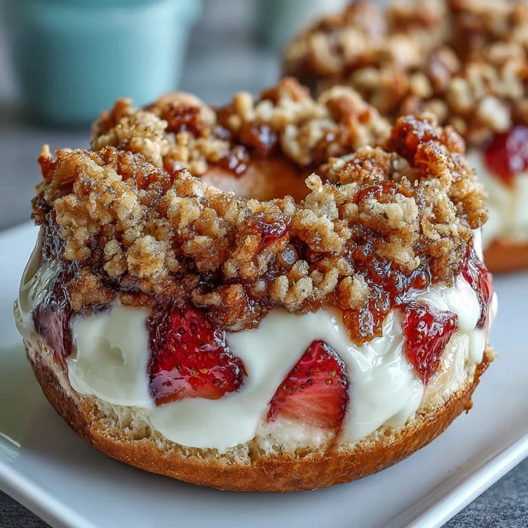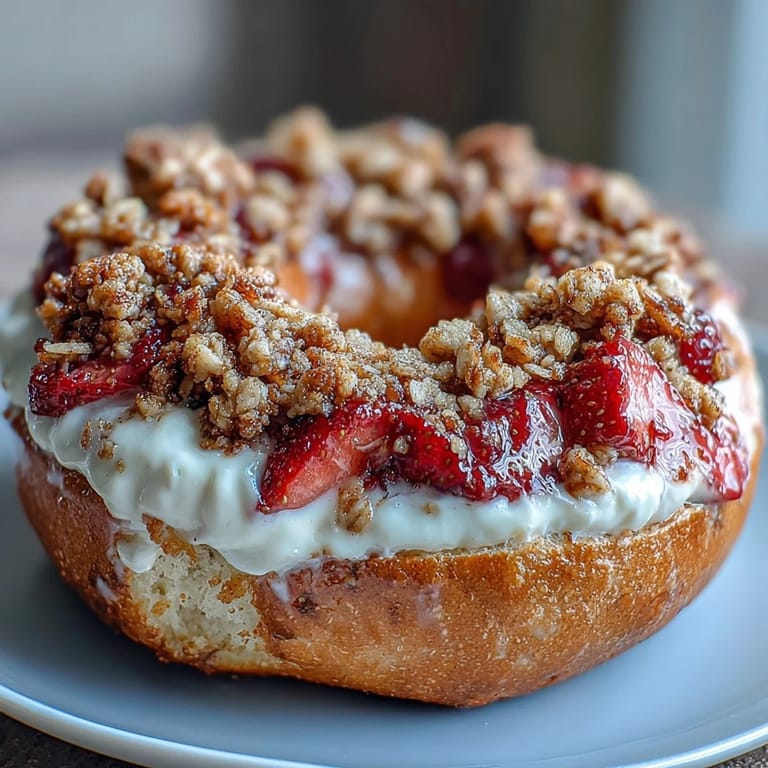 These bagels are a game-changer for anyone looking to elevate their breakfast routine with something both nutritious and delicious. The dough itself is surprisingly easy to work with, combining all-purpose flour, whole wheat flour, and protein powder with tangy Greek yogurt to create a texture that's tender yet satisfyingly chewy. Fresh strawberries are folded right into the dough, releasing their natural sweetness as they bake. The real magic happens when you create a well in each bagel and fill it with a luscious cream cheese mixture, then top it off with a golden, buttery crumble that bakes to perfection.