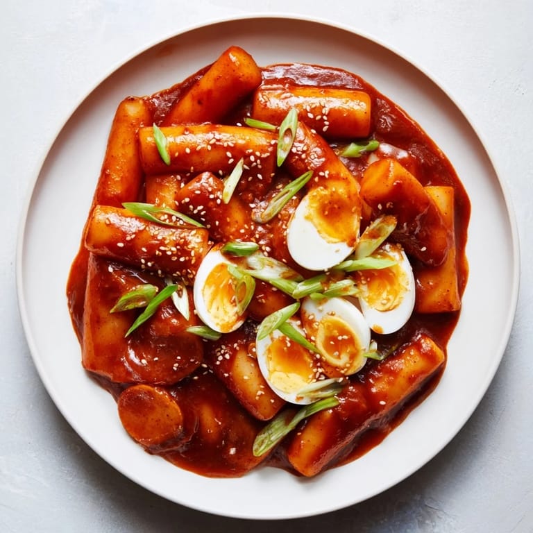 Save to Pinterest My first real encounter with tteokbokki wasn't in a fancy restaurant—it was from a vendor's cart on a rainy Seoul street, the kind where steam rose off the simmering pot and people gathered despite the downpour. I bought a small cup just to warm my hands, but the first chewy rice cake coated in that fiery-sweet gochujang sauce changed how I thought about street food entirely. Now, whenever I make it at home, I chase that exact feeling: the way the kitchen fills with the aroma of garlic and gochugaru, the satisfying softness of the rice cakes, and that moment when someone takes their first bite and their eyes widen slightly at the perfect balance of heat and sweetness.